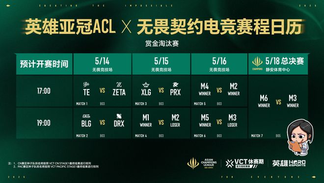无畏契约电竞赏金淘汰赛将于5月14日17:00正式打响!来自CN与PAC的六支顶尖战队TE、ZETA、BLG、DRX◆★、XLG、PRX将展开为期四天的激烈角逐。最终总决赛将于5月18日17:00在静安体育中心揭幕。